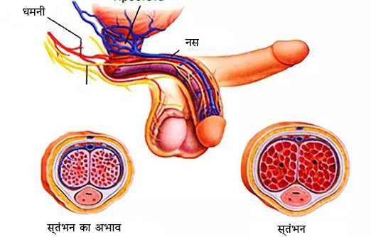 - इसके लिए, मुझे आपको यह बताना होगा कि जैव-भौतिक प्रक्रियाओं के स्तर पर पुरुष में स्तम्भन कैसे होता है। देखिए, पुरुषों के लिंग में जाने वाली 2 बड़ी रक्तवाहिनियॉं होती हैं। रक्त की आपूर्ति जिस वाहिनी से होती है, उसे पृष्ठीय धमनी कहते हैं। एक अन्य वाहिनी रक्त को बहाती है, जिसे पृष्ठ शिरा कहते हैं। लिंग संरचनात्मक रूप से स्वयं में एक स्पंज है, जो उत्तेजित होने पर रक्त से भर जाता है (इस समय लिंग का आकार बढ़ जाता है)।